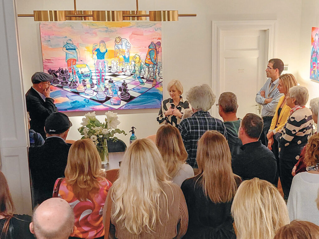 A héber „L’chaim” szó jelentése „az életre”, amelyet ünnepi köszöntésként vagy koccintáskor mondanak. „Az élet hullámvölgyei is megjelennek a képeken, mégis azt gondoljuk, hogy az élet szép és örömteli, és ezek a képek ezt az életérzést közvetítik” – mondta Soós Nóra a tárlatvezetésen. Azt is elárulta, hogy festészete alapvetően gondolati alapú, erős interakcióban áll a jelennel, de olykor egy-egy látvány is inspirálja: például idén készült, Lépésről lépésre című képét a Villa11 fekete-fehér, sakktáblaszerű padlóburkolata ihlette. Figuráit általában nem látjuk szemből, mert így jobban megmarad az alakok absztrakt jelentéstartalma. Azt is megtudtuk, hogy képeinek élénk színvilága a minket körülvevő digitális képek erős, kontrasztos, élénk jellegére reflektál.